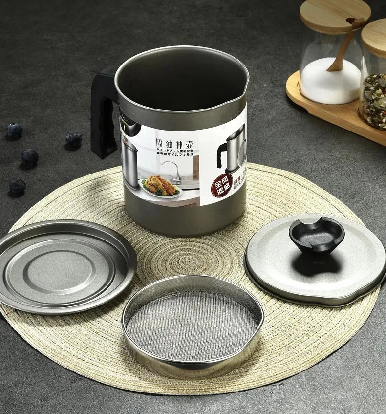 - The High-quality stainless steel oil pot with a fine mesh strainer and a lid. removable stainless steel mesh filter to trap the tiniest particles of food. filter out the residue in the oil so you can reuse the frying oil.